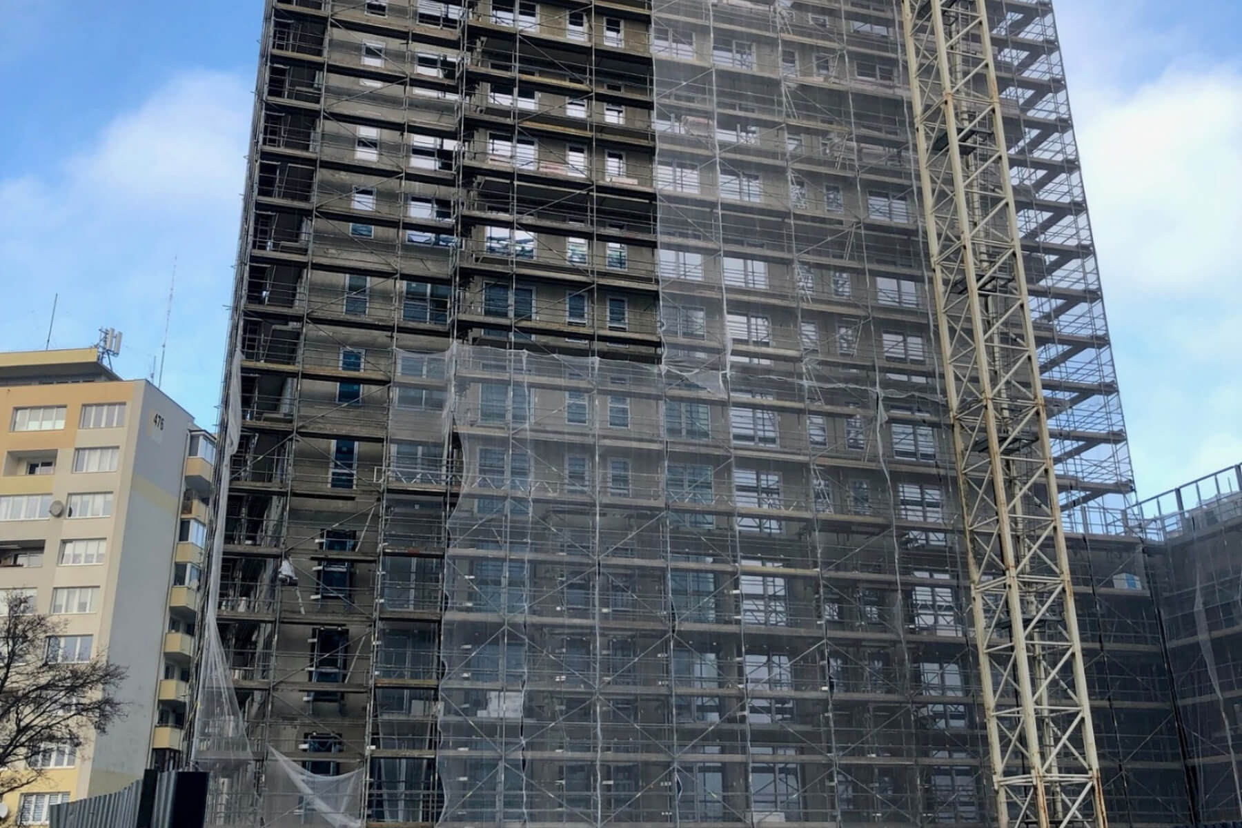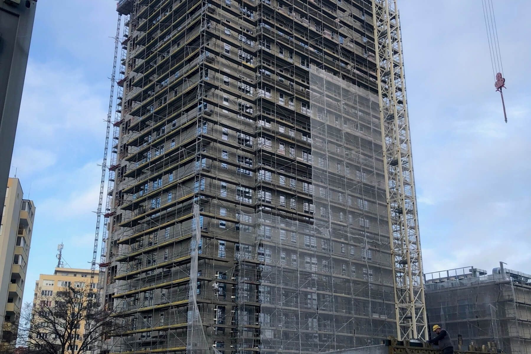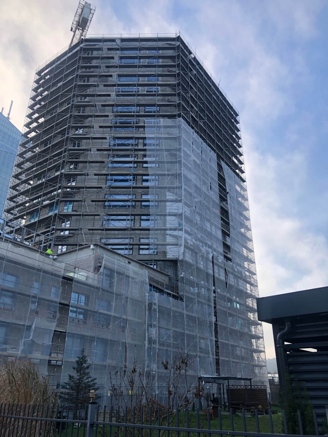 Zakończono wykonanie konstrukcji budynku. Wykonano warstwy izolacyjne dachu oraz zrealizowano montaż stolarki okiennej. Obecnie prowadzone są roboty elewacyjne obejmujące montaż izolacji termicznej na ścianach zewnętrznych obiektu, a także prace związane z montażem balustrad na balkonach.